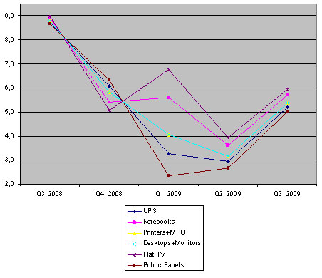 Используя простейший аддитивно-мультипликативный алгоритм обработки всех вышеупомянутых коэффициентов, можно получить итоговую активность покупателей на различных товарных рынках в разные периоды времени (см. рисунок). Например, в I квартале 2009 г. активность на рынке ноутбуков составляла 5,6 баллов, а на рынке ИБП — всего 3,3 балла. Наибольший разброс активности покупателей был в I квартале 2009 г., далее произошла определенная консолидация, и закономерность изменения коэффициентов во времени была во всех группах очень похожей.