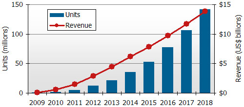 Компания DisplaySearch прогнозирует активный рост, начиная с 2010 г., рынка карманных проекторов (их еще называют пикопроекторами), как в качестве автономного устройства, так и во встроенном виде. По данным компании, в 2009 г. в мире было продано 0.5 млн таких миниатюрных проекторов на сумму 117 млн долл., и далее вплоть до 2018 г. ожидается рост со среднегодовыми темпами 88% в штучном исчислении и 70% — в денежном. В результате, к концу периода DisplaySearch рассчитывает на годовые продажи в объеме 142 млн шт. на общую сумму 13.9 млрд долл. (см. рисунок).